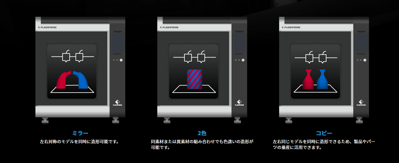 左右に独立して稼働するエクストルーダーを搭載しているため、多様な造形ができます。