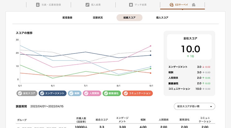 会社全体や部署・職種だけなく、入社年度や評価上位者等、任意のグループでのスコアが自動で集計されます。スコアの推移も可視化できるため、どの項目に課題があるかがひと目で分かります。