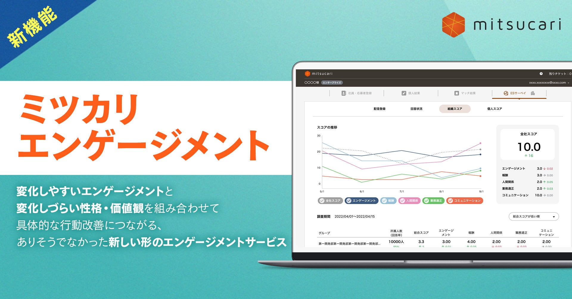 ひとりひとりの性格や相性を理解・分析して個と組織の力を最大化するHR Tech「ミツカリ」を提供する株式会社ミツカリ(本社:東京都渋谷区、代表取締役社長CEO:表 孝憲)は、2023年3月15日より、ワークエンゲージメントや従業員満足度を取得する「ミツカリエンゲージメント」機能の提供を開始することをお知らせいたします。