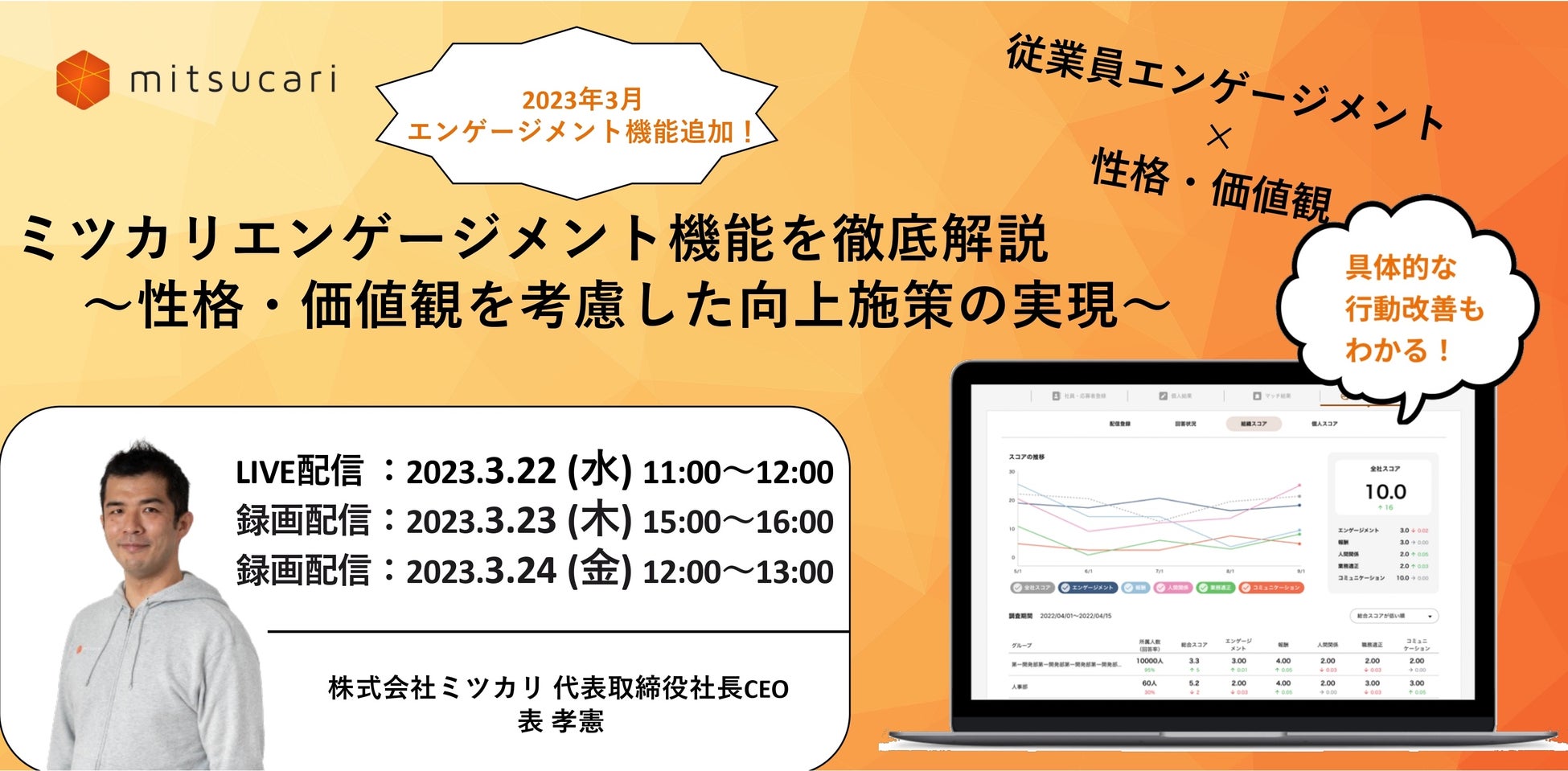 ミツカリエンゲージメント機能のリリースにあわせて、開発の背景や操作方法・分析結果画面の見方、業務における具体的な活用方法を解説する無料ウェビナーを3月22日(水)11時から開催いたします。