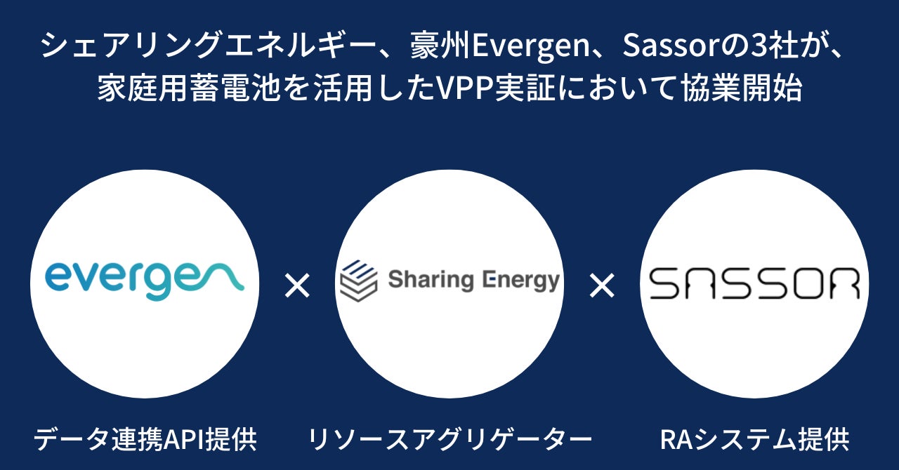 太陽光発電システムの第三者所有サービス「シェアでんき」を提供する株式会社シェアリングエネルギー(本社:東京都港区、代表取締役:上村一行、以下シェアリングエネルギー)は、Evergen Pty Ltd(本社:Australia Newcastle East、CEO:Ben Hutt、以下Evergen)および株式会社Sassor(本社:東京都目黒区、代表取締役:石橋秀一、以下Sassor)と業務提携しました。シェアリングエネルギーが所有する分散電源を活用したエネルギーマネジメントの技術検証及び商用化の検討を実施します。