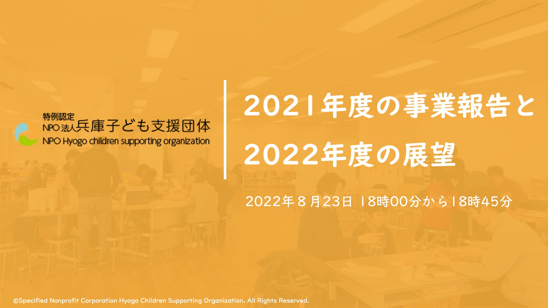 特例認定NPO法人兵庫子ども支援団体(所在地:兵庫県明石市、代表理事:多田実乘、以下「当法人」という)は、2021年度事業報告会を2022年8月23日(火)18時からオンラインにて開催いたします。当日は、兵庫子ども支援団体が取り組んできたことや2022年度の展望についてお話をさせていただきます。