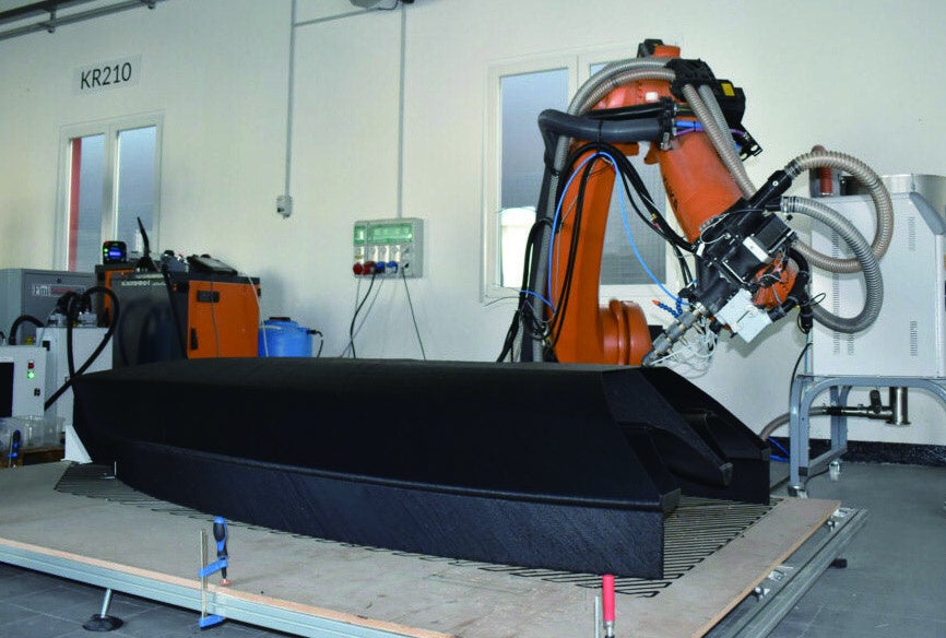 最大4000 x 4000 x 3000 mm の製品や部品の製造を可能にした、ロボットアーム式大型樹脂3Dプリンターです。造形ヘッド、ペレットの乾燥機、削るためのツール、ソフトウェアなど、稼働するために必要なすべてが揃っています。幅広い高性能ポリマーから複合材料、リサイクル材料まで対応しており、ペレットから直接製造できるため材料費が大幅に削減されます。さらに、Heron AMのツールで削ることで、表面のざらつきがほぼない高品質な造形を実現。またロボットアーム式でサポートレスで造形できるため、複雑な形状をした大型サイズの造形が容易になりました。