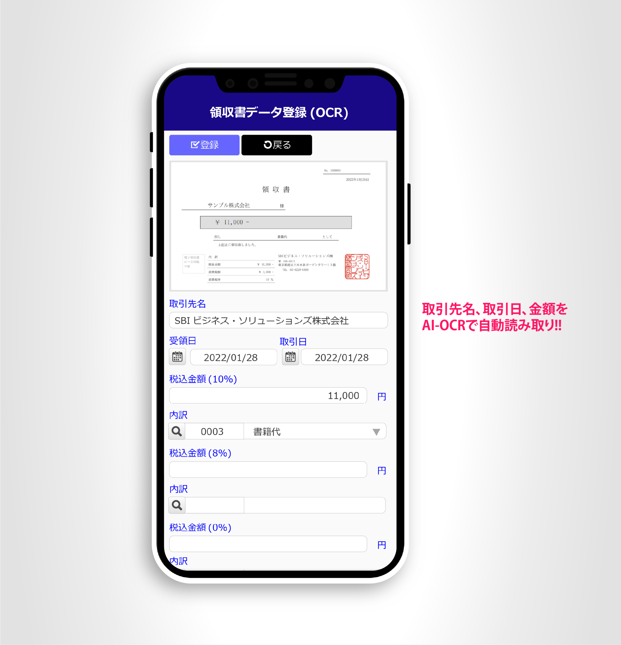 <「領収書AI-OCR」を使用したデータ登録イメージ(スマートフォン画面)>