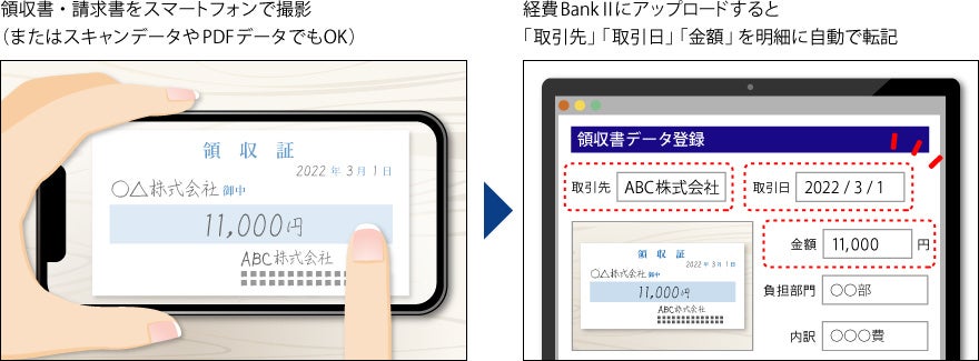 「経費BankII」では、一つのアプリケーション上で領収書と請求書それぞれに最適化したエンジンのAI-OCR機能がシームレスに利用可能なため、「領収書」「請求書」における各申請業務の大幅な効率化に貢献します。
