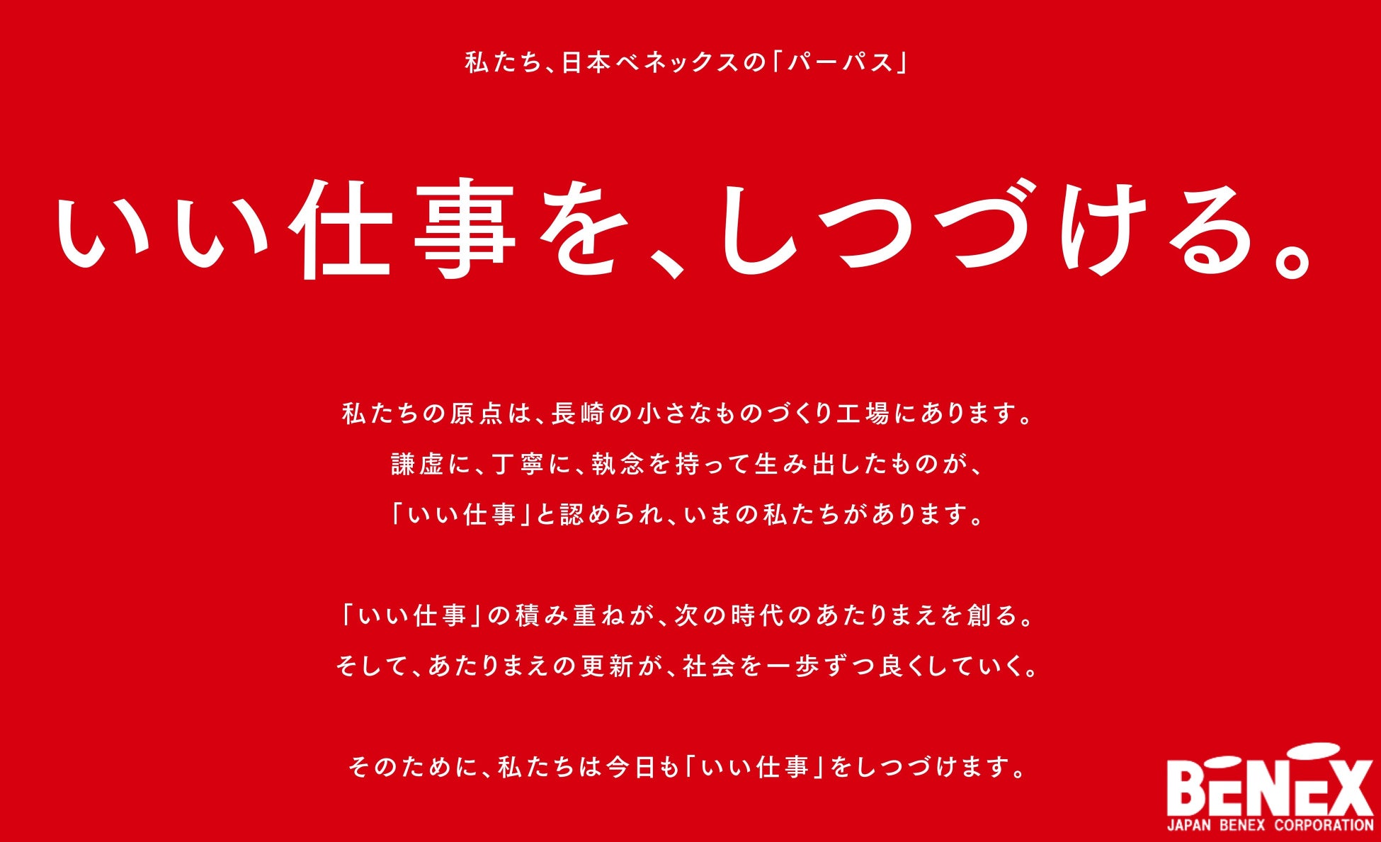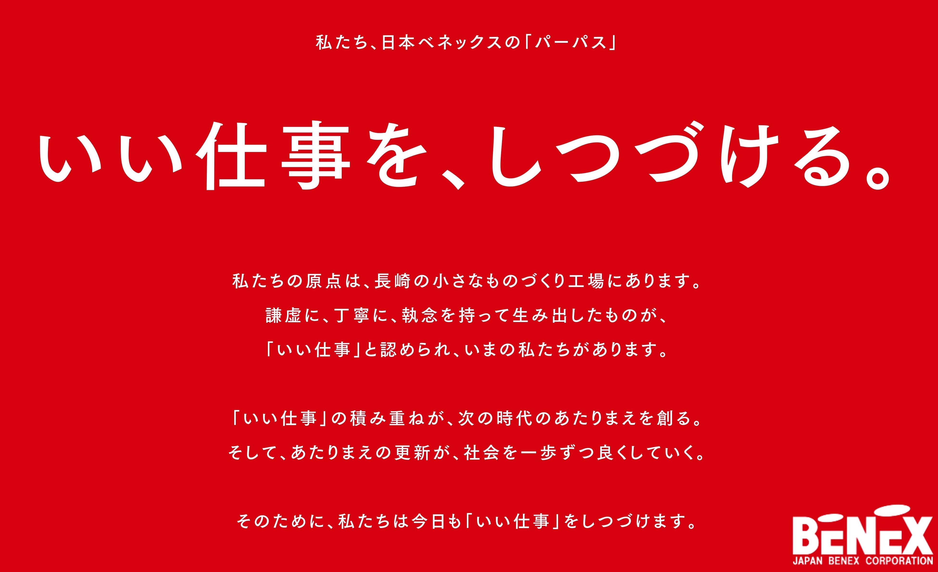 パーパス「いい仕事を、しつづける。」の元、日本ベネックスは新しいチャレンジを重ねながら成長し続けるとともに、ものづくりの力を生かした新しい価値の創出によって、社会への貢献を目指します。