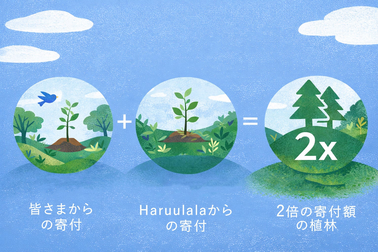Haruulalaはお客様の寄付金額と同額を拠出し、1口あたり合計200円分の植林支援を行います。