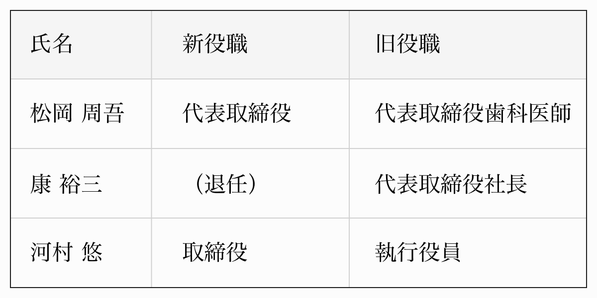 当社は2017年の創業以来、歯科医療のドメインに特化した事業運営を行なってまいりました。2020年より共同代表制を敷いておりましたが、この度経営体制を見直し、創業者の松岡が単独での代表取締役となりました。また同時に、現執行役員の河村を、取締役として新たに選任しております。