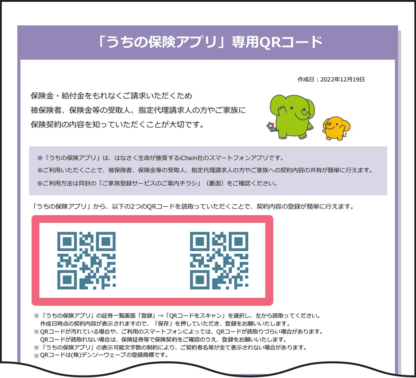 保険の契約者がうちの保険に保険情報を簡単に登録、管理できるよう、なないろ生命とはなさく生命には、うちの保険専用のQRコードを各社の保険証券など一部の通知物に掲載頂きます。契約者がスマートフォンでQRコードを読み取ると、保険証券番号などを手入力せずに即時で簡単にデータを登録できます。