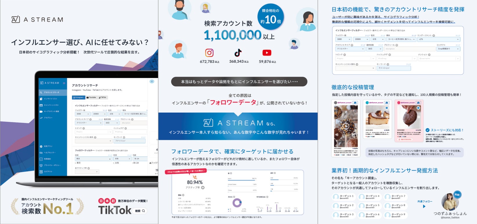 『A stream』はこれまで取得不可能であった、インフルエンサーのフォロワーの”興味関心”や”ブランドの好み”といったサイコグラフィック情報の分析を可能にする新時代のAIマーケティングツールです。