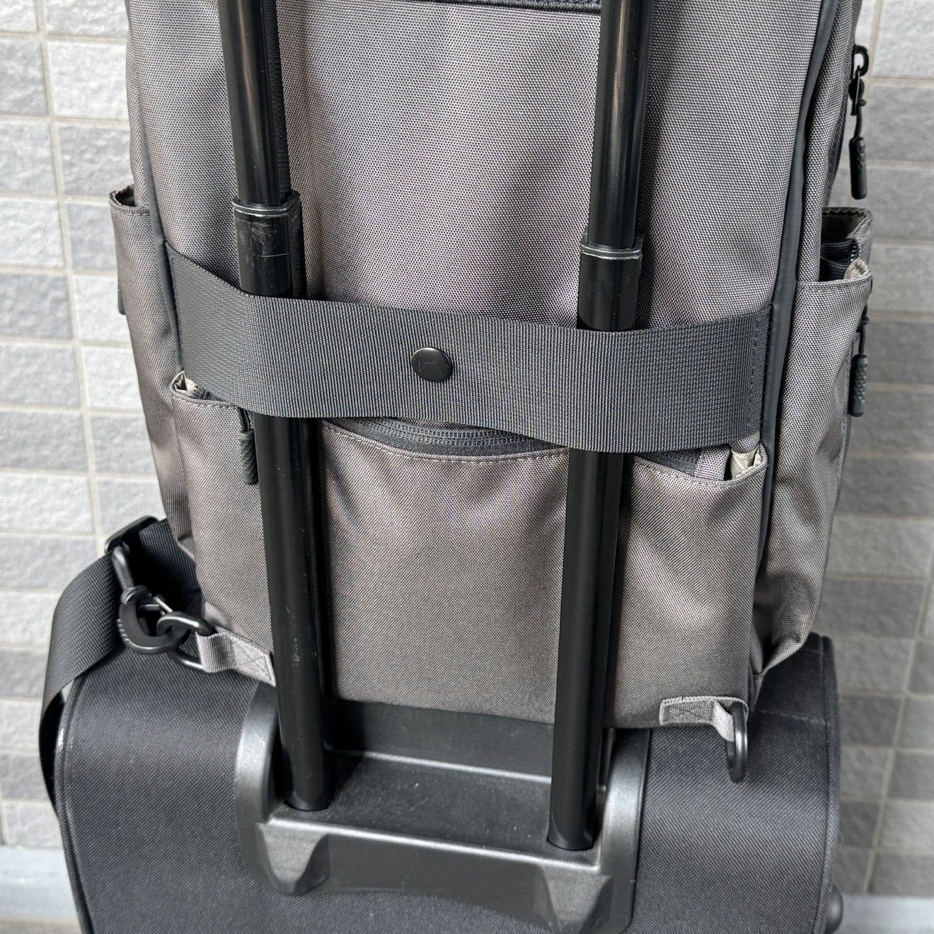 キャリーのハンドルに通すことでバッグを安定して固定でき、移動時の負担を軽減します。