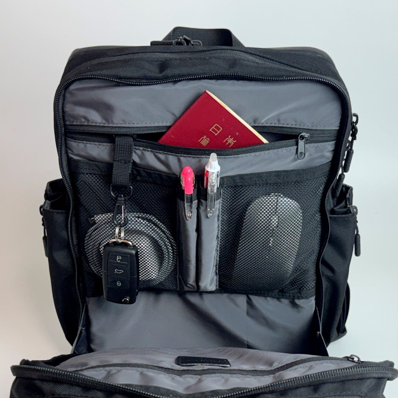 ファスナーポケットのほか、マウスも入るパスポートサイズのメッシュポケット、ペン差しを備えています。