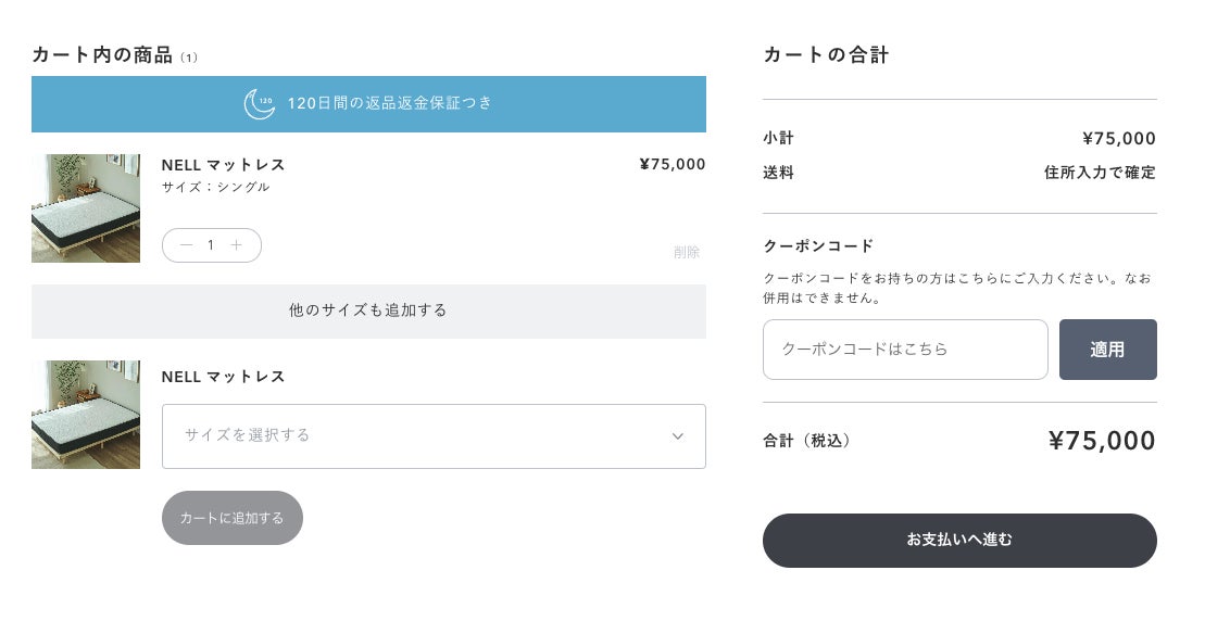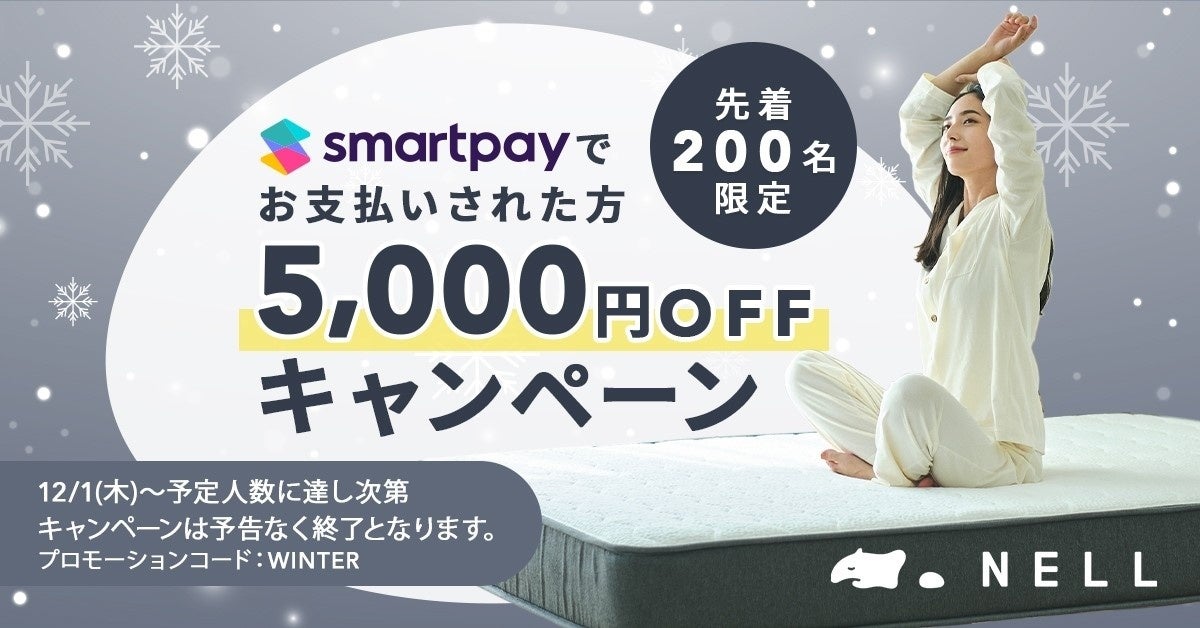NELLでは、睡眠の質が下がりやすいこれからの季節でも良い睡眠をとっていただくことを目的として、NELLマットレスをご購入いただいた方の中で、Smartpayでの3回払いにてプロモーションコード「WINTER」を入力してお支払いをされた方先着200名限定で、5,000円OFFにてご購入いただけるキャンペーンを開催いたします。