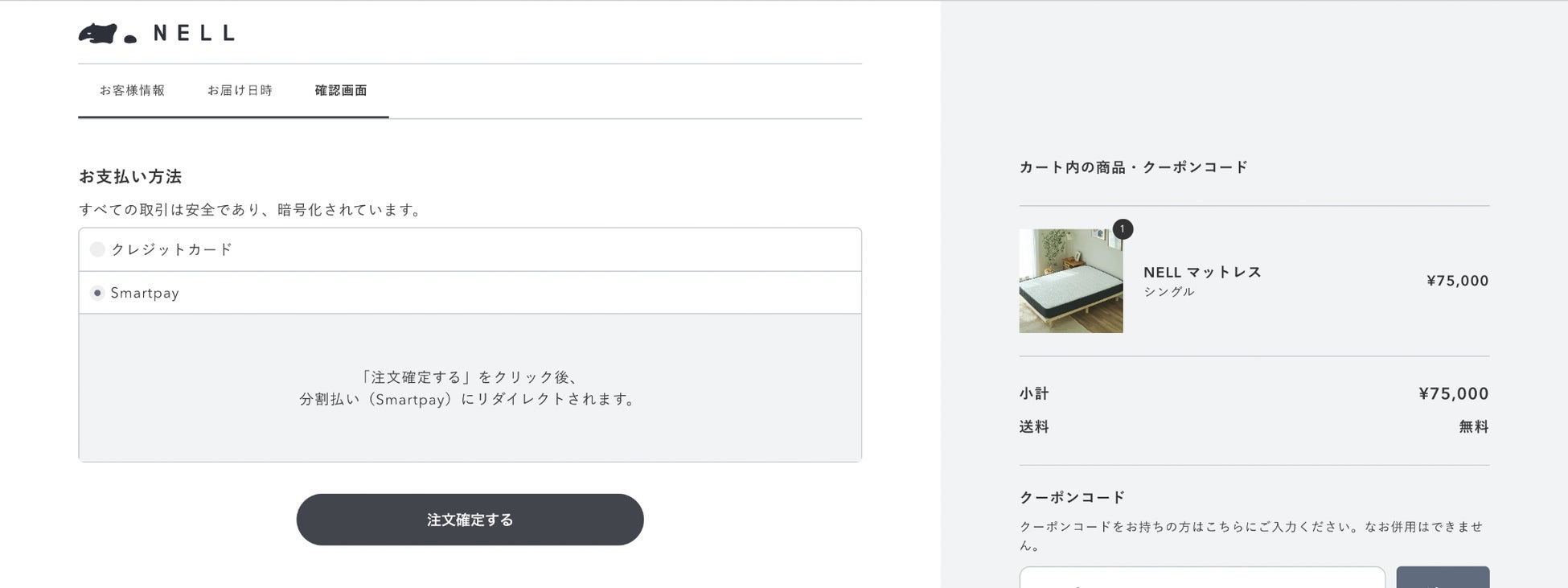 ③注文確定ボタンを押下→Smartpayのログイン画面に遷移します