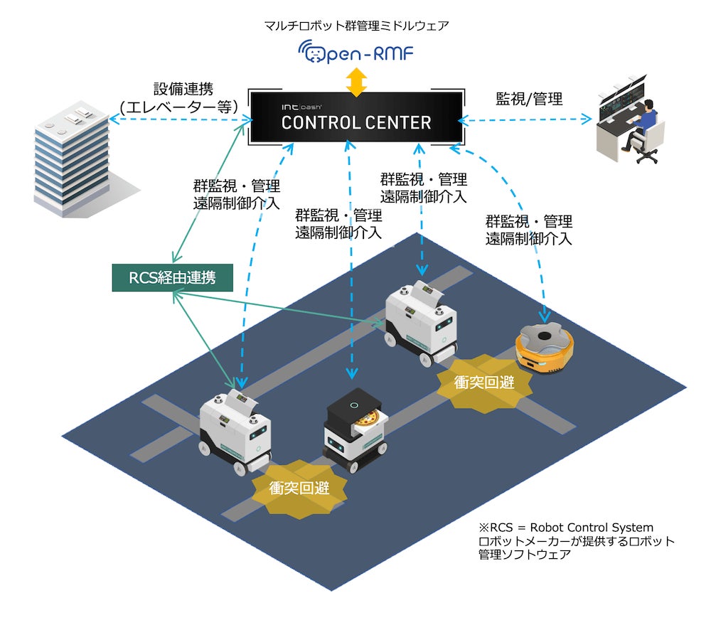 搬送、警備、検査など、商業施設、倉庫、プラントなどの施設内で導入が進む自律ロボットの種類は多岐にわたり、同一フィールドをマルチベンダのロボットが稼働します。こうしたマルチロボットの運用においては、衝突回避やルート・タスク管理など、マルチベンダのロボットを統合管理できる環境が必要となっています。