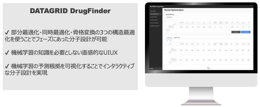 こうした機能によって、『DATAGRID DrugFinder』は、創薬化学者とAIとのインタラクションに促進させ、リード化合物の探索・最適化プロセスを加速させ、イノベーティブな低分子医薬を実現します。