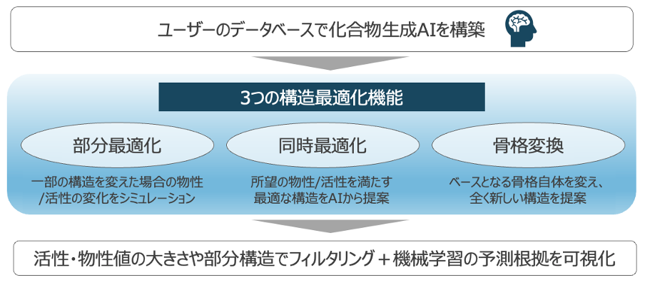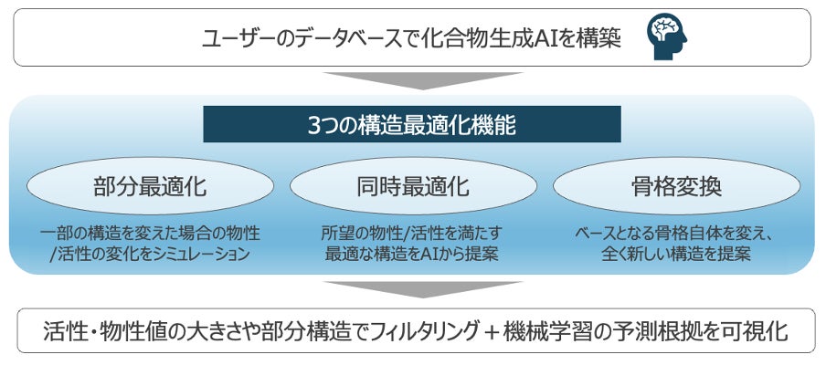 当社ではこれまでジェネレーティブAIの研究開発を続け、製造業を始めとする多様な業界で社会実装をして参りました。本プロダクトでは、こうした当社に蓄積されているジェネレーティブAIの技術をベースに、今回独自に開発した活性や複数の物性を同時に最適化できる最適化技術を搭載しており、新規性がありかつ所望の物性を持った化合物を自動で生成・最適化することができます。さらに、製薬企業で創薬化学者として合成研究に従事されている方々に対してヒアリングを重ね、フィードバックを受けることで、創薬化学者がインタラクティブに操作でき、かつ説明性の高い結果から合成の方向性を見出すことが容易になっています。こうした独自の最適化アルゴリズム、機能、UIで、創薬科学者とAIによるインタラクティブな分子設計を実現し、リード化合物の探索とリード最適化の高速化を目指します。