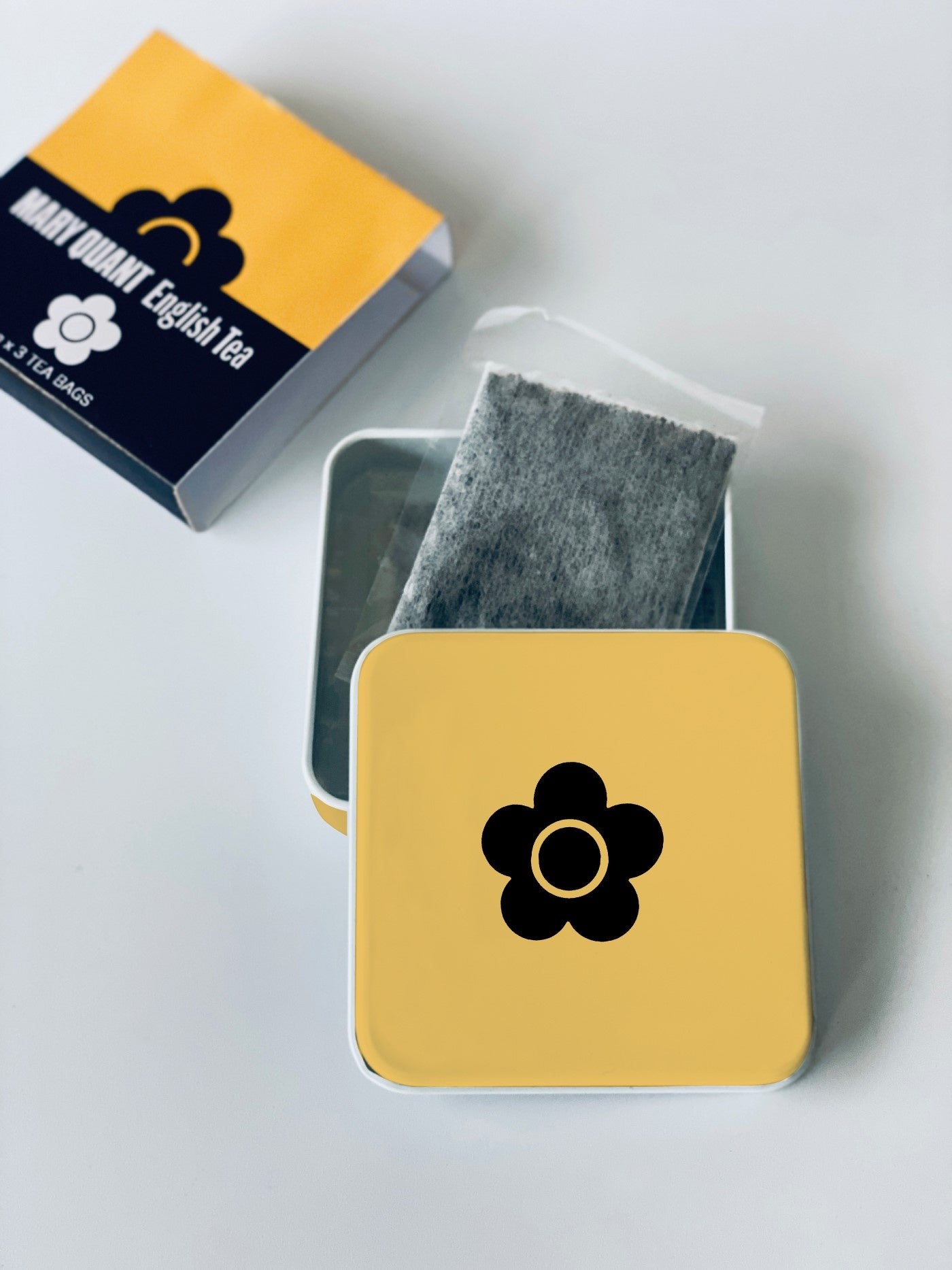 本展オリジナルグッズの紅茶缶と前売券がセットになった、お得なセット券を数量限定で販売中です。60年代にマリー・クワントから発売されたメイクアップ用クレヨンが入った黄色い缶をイメージしたパッケージに、イギリスらしい濃くて美味しい紅茶のティーバッグを入れました。