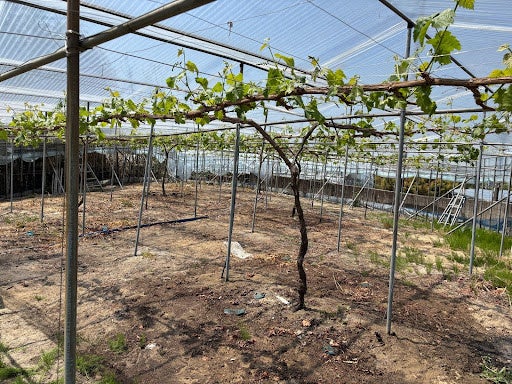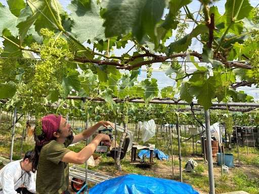 今回の試験では、3軒の生産者に協力いただき、巨峰(成木)、デラウエア(成木)、シャインマスカット(若木)に灌注処理を実施しました。梅雨明けの7月初旬には、2回目の散布も予定しています。その後、大阪府の農業普及員さんが、生育途中の樹勢や、収穫時の実の太り具合や色づきを、通常栽培の区画で育てたブドウと比較するという流れです。
