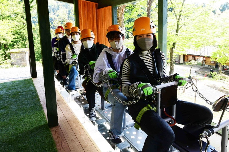 セレモニー終了後、「コベンチャーパーク」をなかよしこども園と池田小学校低学年のみなさんが、「ジュニアディスカバリーコース」を池田小学校 4~6 年生のみなさんが体験。「ジュニアディスカバリーコース」では本格的なアスレチックエントリーコースへの挑戦に、子どもたちの歓声が上がりました。また、ジップラインエリアでは、これまで徒歩移動だったスタート地点までの区間に新設された「ドラゴンライン(モノレール)」に福井工業大学の大学生が乗車して、山の斜面からの景色を楽しみました。