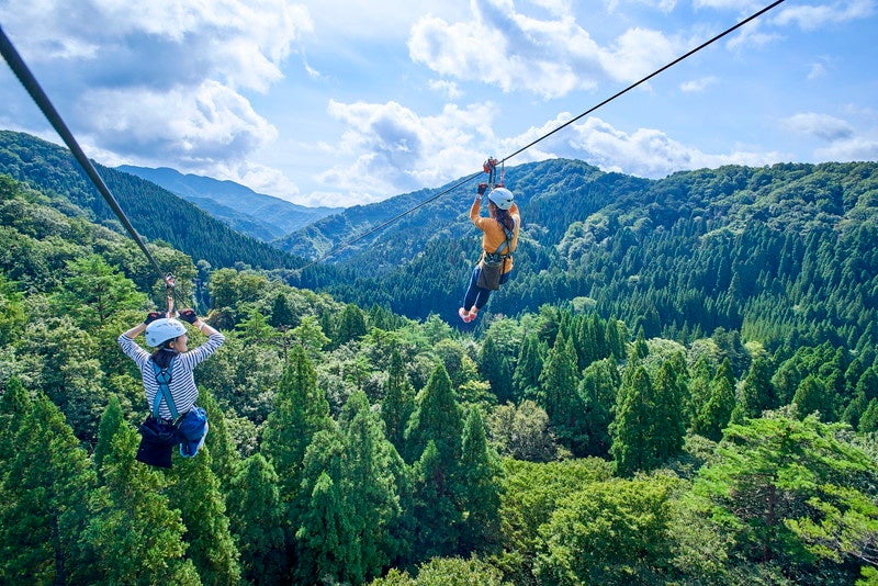 「メガジップライン」は、山の尾根(標高339m)からスタートし、2つの谷を越えて往路480m・復路510mを滑走します。地上高60mは20階建てのビルの高さに相当し、鳥の視点で志津原の森の上空から壮大さや美しさを見渡せます。更に、ダブルラインで友人同士やカップルで同時に飛ぶことができます。