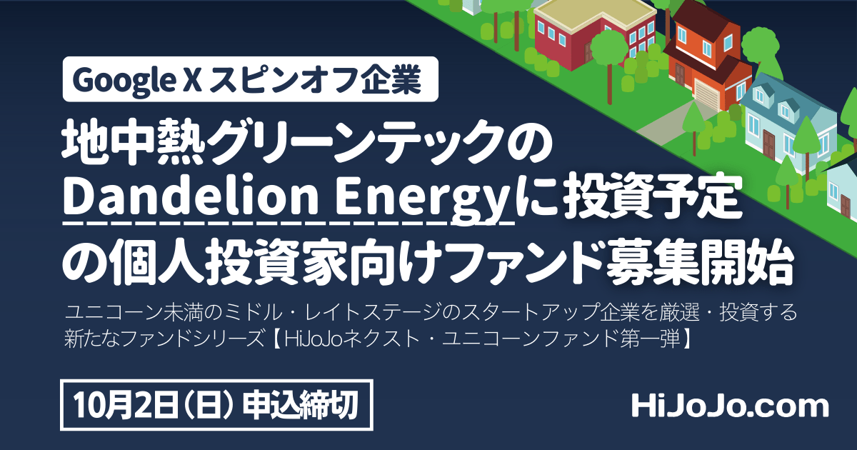 | 投資予定企業 | Dandelion Energy, Inc. 以下の当社サイトで企業の概要をご紹介しています。 https://www.hijojo.com/directory/763 |