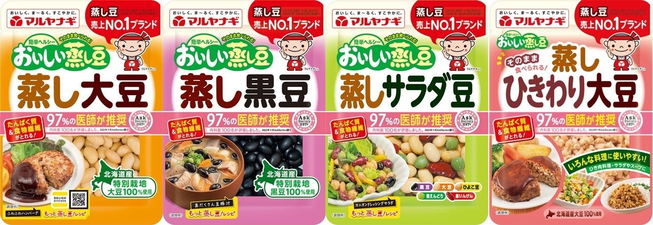 さらに、エムスリー株式会社が提供する「AskDoctors評価サービス」にて、100名中97%の医師の推奨意向を得て「AskDoctors医師の確認済み商品」マークを取得したことから、このひきわりタイプ蒸し大豆の使い勝手の良さ、健康価値をもっとお客様に分かっていただきやすいパッケージにしたいと考え、9月1日より「おいしい蒸し豆 蒸しひきわり大豆」として、主力商品「おいしい蒸し豆」シリーズとイメージを合わせたデザインに生まれ変わりました。