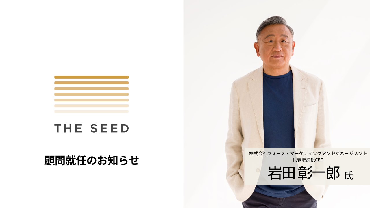 シード投資家「THE SEED」 (本社:東京都渋谷区、代表:廣澤 太紀、以下THE SEED)は、アスクル創業者であり、株式会社フォース・マーケティングアンドマネージメント 代表取締役CEO 岩田彰一郎氏が顧問に就任したことをお知らせします。