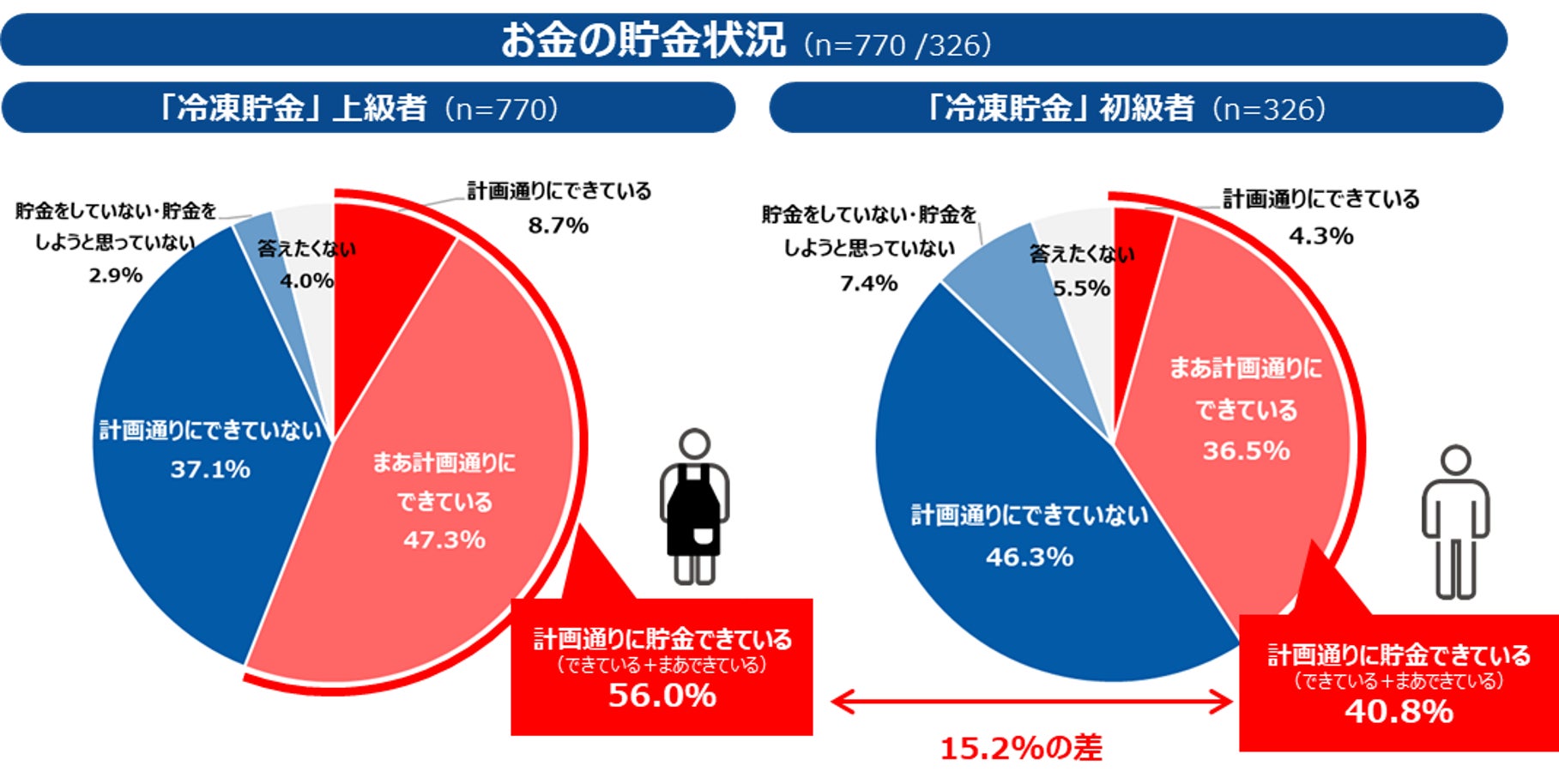 続いて「冷凍貯金」上級者と初級者※のお金の「貯金」状況について比較。その結果、「冷凍貯金」初級者は「計画通りに貯金できている」と回答した人が40.8%であったのに対し、 「冷凍貯金」上級者は半数以上の56.0%が「貯金できている」と回答し、約15%も差がみられ、「冷凍貯金」がうまい人ほど、計画通りの貯金ができていることが分かりました。(Q7)