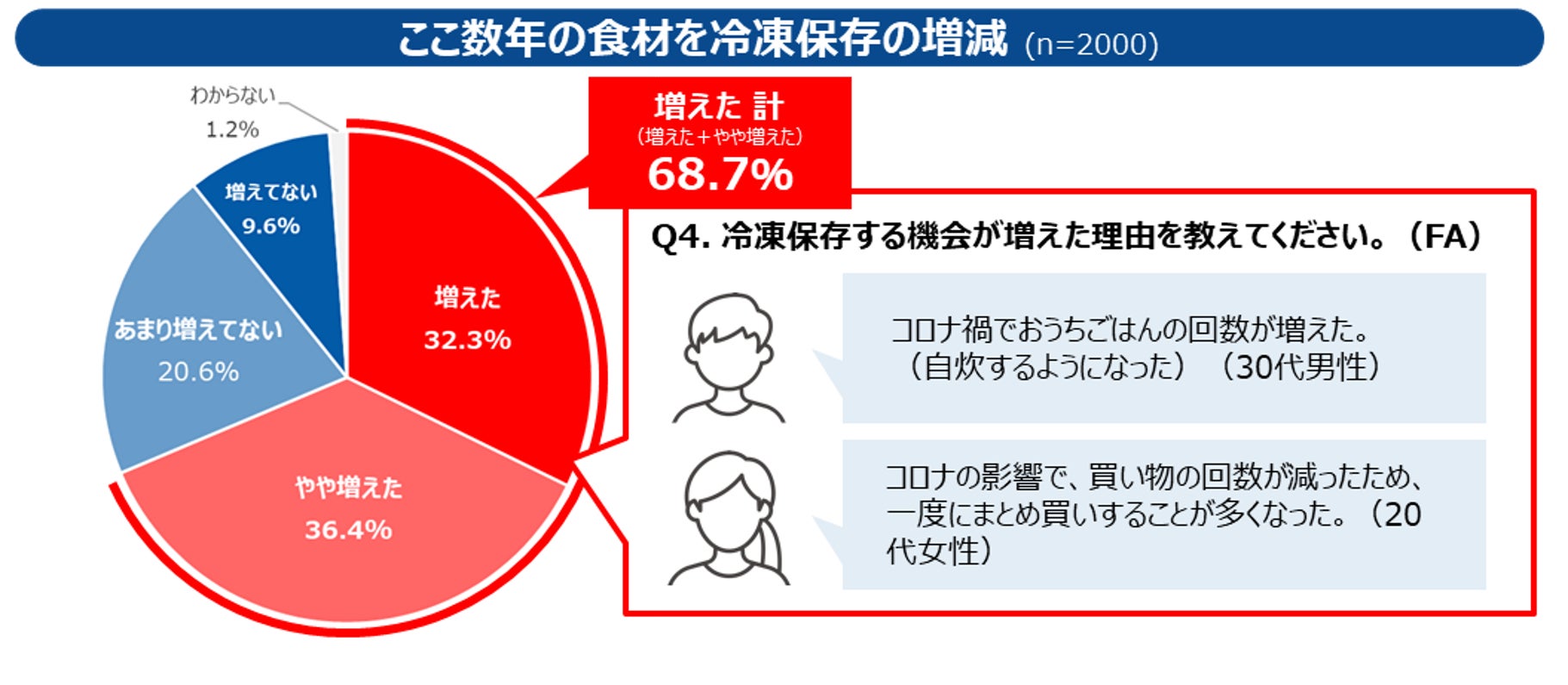 続いて、「冷凍トレンド」に関して調査。「ここ数年で、食材を冷凍保存することが増えた」と回答した人は、全体の約7割に上り(Q3)、その理由として「おうちごはんの回数が増えた(30代男性)」、「コロナで買い物の回数が減った(20代女性)」など新型コロナウイルスの感染拡大が影響し、日常の料理の中でも一層、冷凍保存のニーズが高まっていることが分かりました(Q4)。