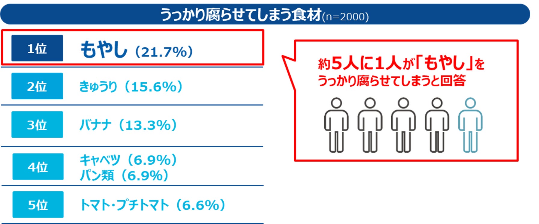 | TOPIC❶:食材を腐らせやすい梅雨~夏場は要注意!1人あたりの年間食材廃棄量は、約45.6kg! 中でもうっかり腐らせてしまう食材1位は、家計の味方の人気野菜「もやし」 |