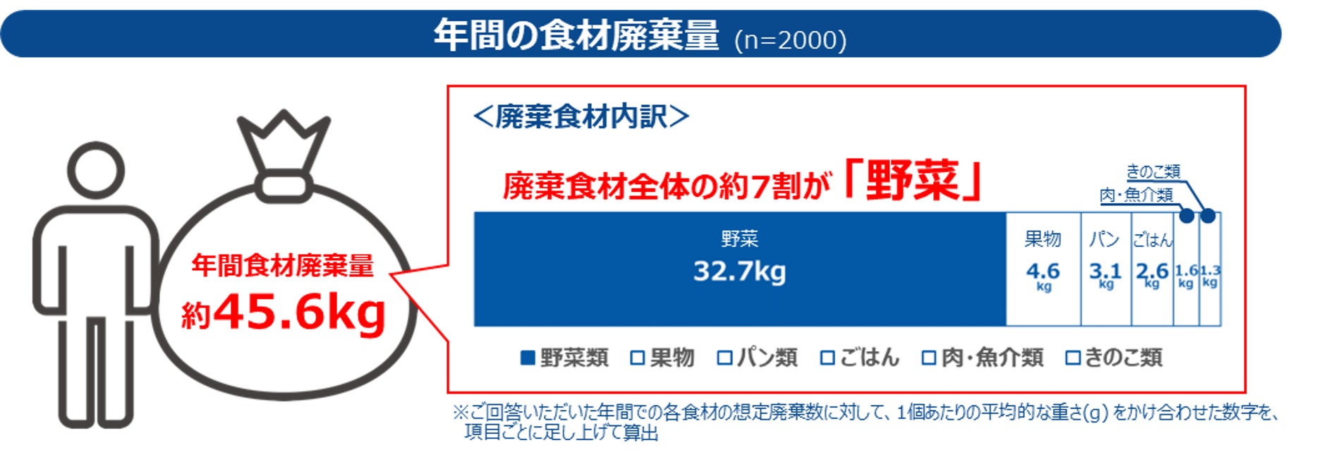 ✔ 1人あたりの年間食材廃棄量:平均約45.6kg(回答者2,000人を合計すると、年間約9.1トンの食材廃棄量)