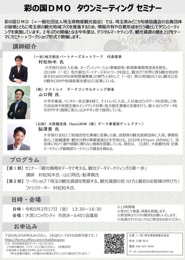 業務に役立つデータマーケティング知識の習得を目的としたプログラムの第1部には、埼玉県「彩の国DMO強靭化検討委員会」委員も務める地方創生パートナーズネットワーク代表理事の村松知木、パートナーのナイトレイ山口翔氏、大阪観光局(Vpon JAPANから出向)の鮎澤貴氏の3名が、「観光戦略をデータで考える、観光データマーケティングの第⼀歩」をテーマにセミナーを、続く第2部では「埼⽟の観光資源を発掘する、観光資源の⾒つけ⽅と最初のお客様の呼び⽅」を考えるワークショップを実施します。- 「彩の国DMO 令和4年度タウンミーティング」開催概要