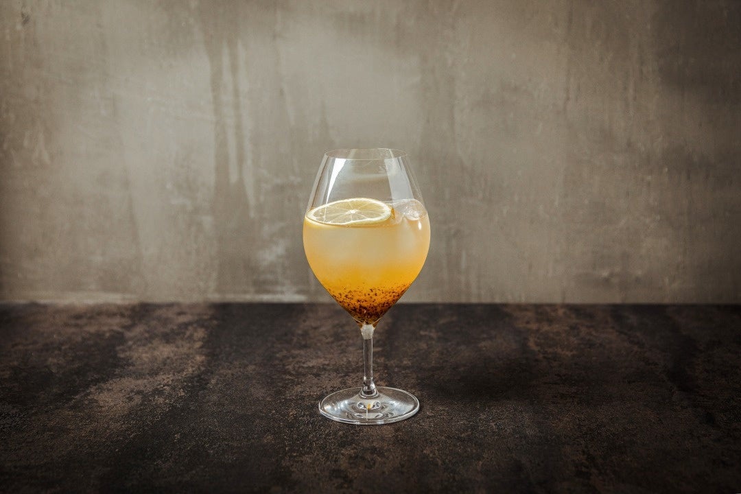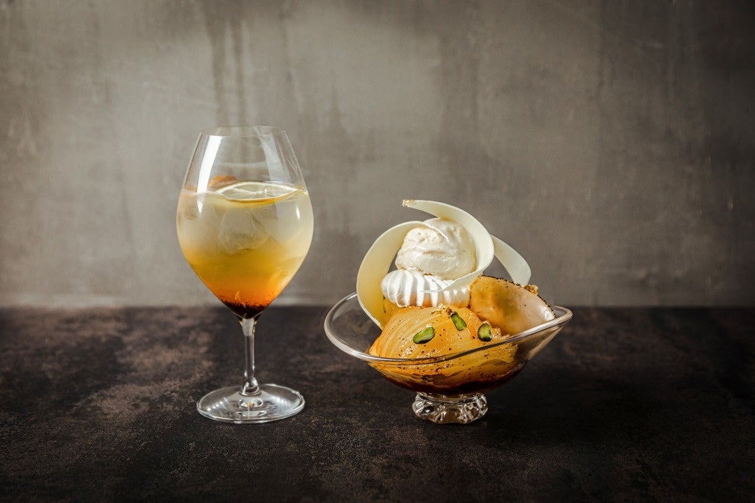パフェでも使用している、バニラよりも濃厚な香りをもつトンカと、アールグレイを使って香り付けしたル・レクチェのコンポートジュレをシャープで爽やかな酸味が特徴のソーヴィニヨン・ブランの白ワインで割った1杯。