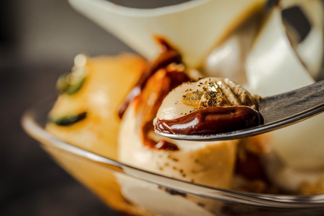 TOPには、バニラよりも濃厚な香りをもつトンカと、アールグレイを使って香り付けしたル・レクチェのコンポート、アールグレイを煮出した生クリームとホワイトチョコレートでロイヤルミルクティーのような味わいに仕立てたアールグレイムース、ジャスミンの香り付けをしたメレンゲの上に据えたバニラアイスクリームを据えました。そこに繊細なホワイトチョコレートのチュイールと、リッチな食感のキャラメルクリームをお客様のお好みの量をかけていただくと、洋梨と紅茶の品のある芳香をさらにリッチに引き立てます。