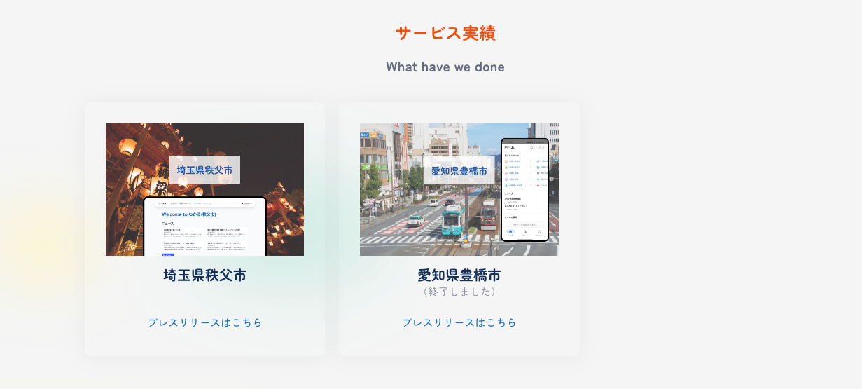 今回のリニューアルではデザインやページ構成を見直し、新コンテンツとして「実績」を追加し、埼玉県秩父市様、愛知県豊橋市様の導入実績を掲載しました。画面イメージなども掲載し、今後導入をご検討される自治体様に対して「わかる」の概要が伝わりやすくなるような構成を心がけました。