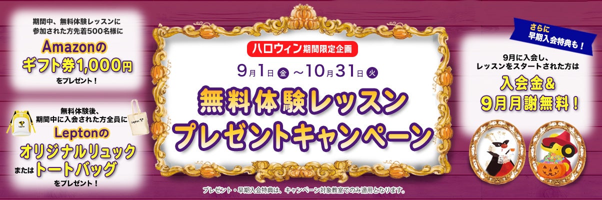 ・(1)は、9月より前にお申し込みいただいた場合でも、体験レッスンのご参加が期間中であれば対象となります。ただし、先着人数に達した場合、キャンペーン期間内に終了となりますので、あらかじめご了承ください。