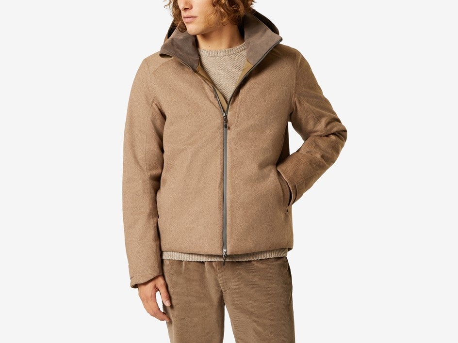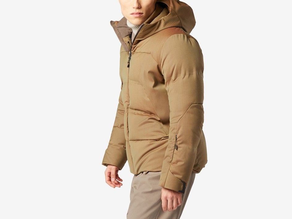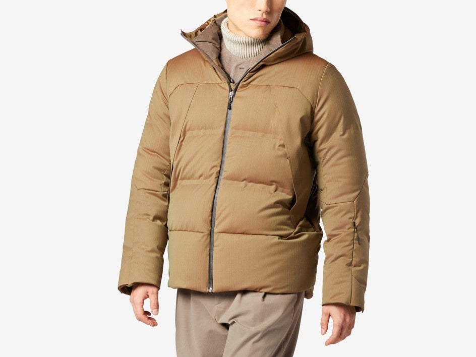 表地にウールとバイオベースによるソラーロ生地を採用したダウンジャケット。