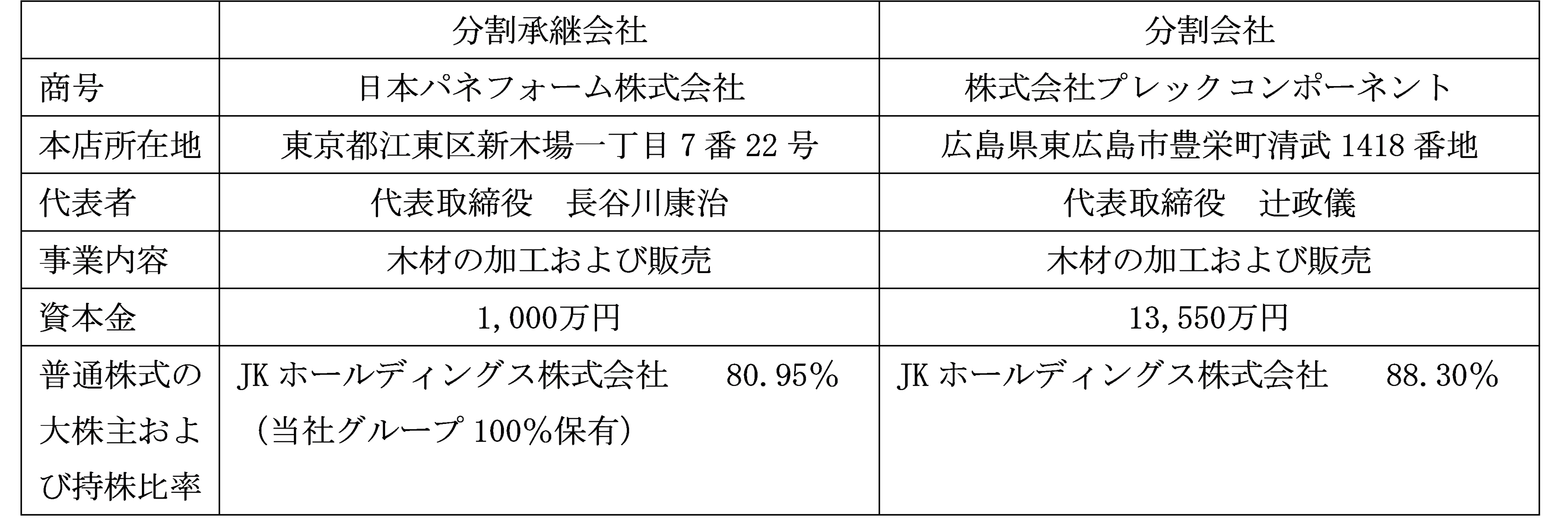 JKホールディングス株式会社(東京都江東区、代表取締役社長 青木慶一郎/以下、JKHD)の連結子会社である株式会社プレックコンポーネント(広島県東広島市、代表取締役社長 辻󠄀政儀/以下、プレック)は、同連結子会社である日本パネフォーム株式会社(東京都江東区、代表取締役社長 長谷川康治/以下、日パネ)に木材加工業の権利義務を承継する吸収分割を行いますので、お知らせいたします。