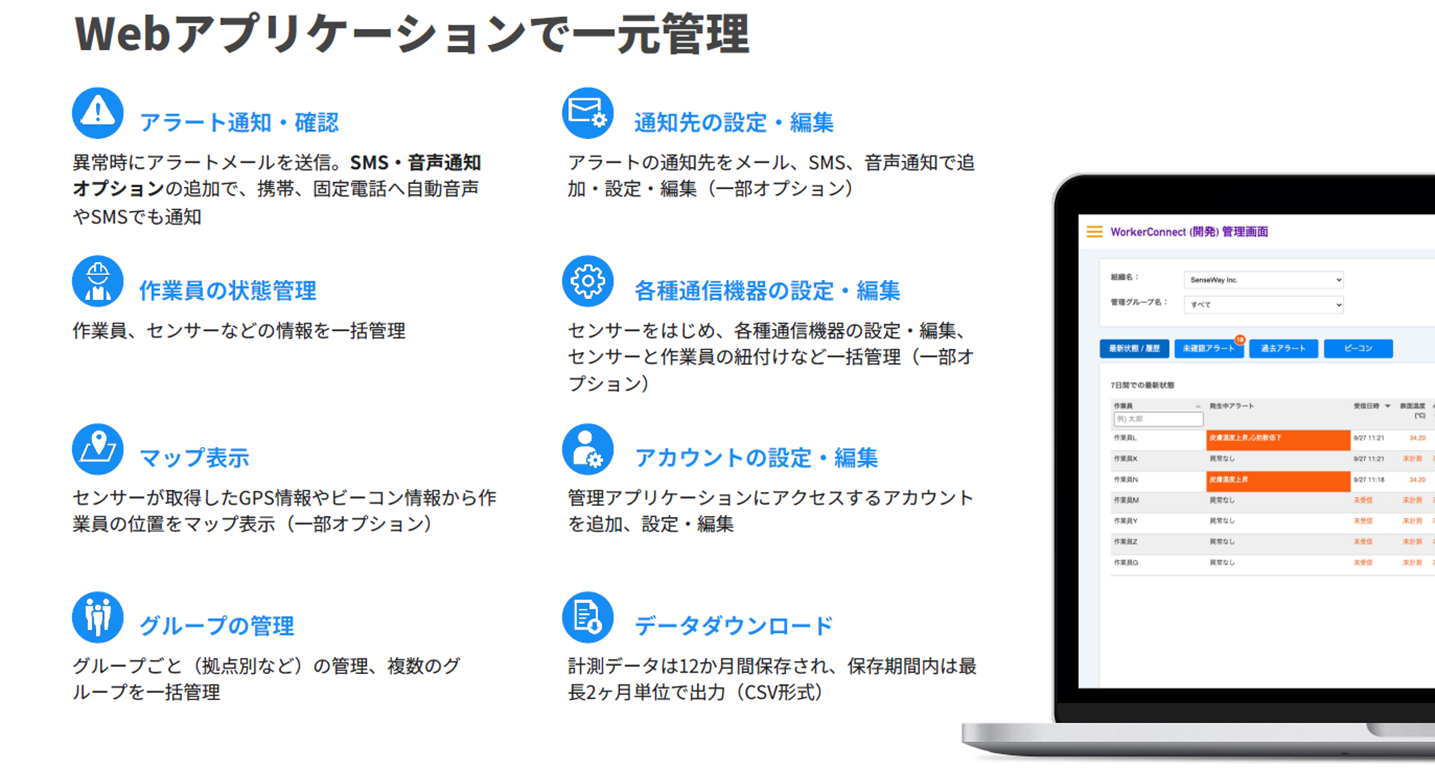 ・アラート機能(転倒検知、皮膚温度、心拍数、SOS、通信エラー)