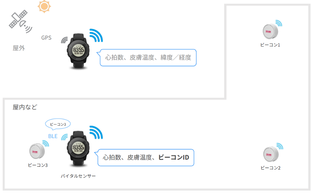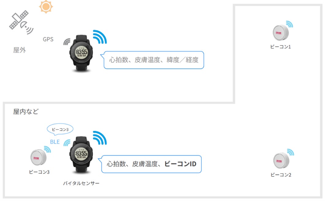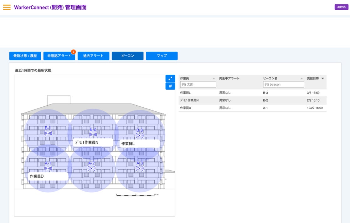 屋内ではビーコンを用いて、屋外ではGPSを利用して作業員の位置情報を捕捉します。これにより、管理者は遠隔地においても作業員の位置情報が一目で把握できるようになります。
