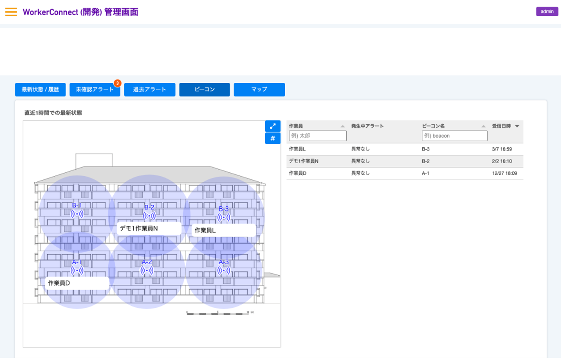 作業現場内に設置されたビーコンを元に、ビーコンの周囲にいる作業員をマップ上に表示します。管理者はアプリケーションを通じて、作業員の位置やアラート状況を確認することができます。マップ上でのビーコンの設置位置や検知範囲の表示は自由にカスタマイズ可能です。
