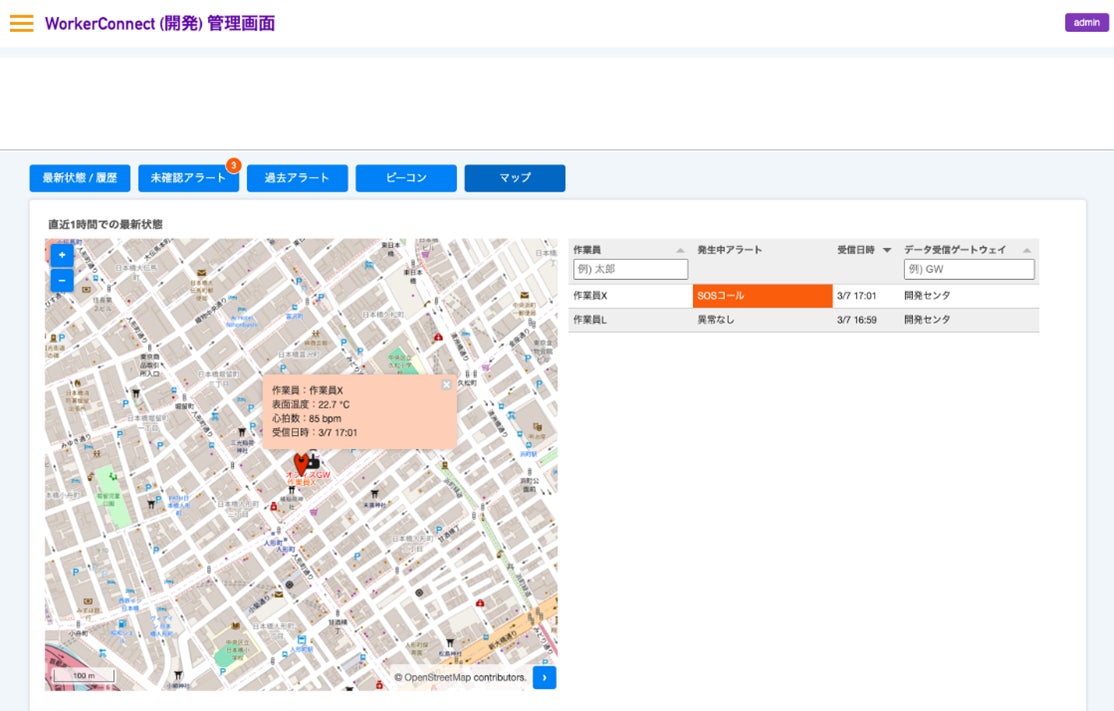 マップ上のアイコンは作業員の健康状態によって色が変化します。異常なしの場合は緑で、アラート状態にあるときは赤で表示されるため、管理者はどの場所にいる作業員にアラートが生じているのかが一目で把握できます。