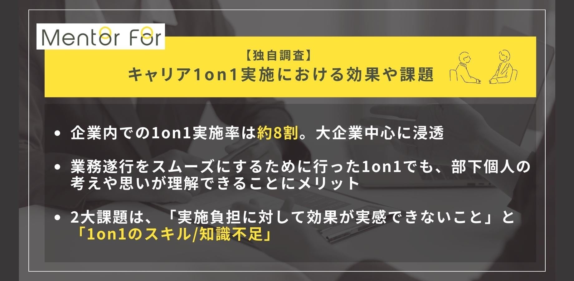 Mentor Forはこれまで組織開発の効果的な手法のひとつとして「キャリア1on1(※1)」を推奨してまいりました。最近では、リモート環境の加速化や、メンバーの価値観の多様化により、さらに1on1の必要性が認知されています。そこで、企業の1on1の実施実態を把握し、現場の課題感を探るためにアンケート調査を行いました。