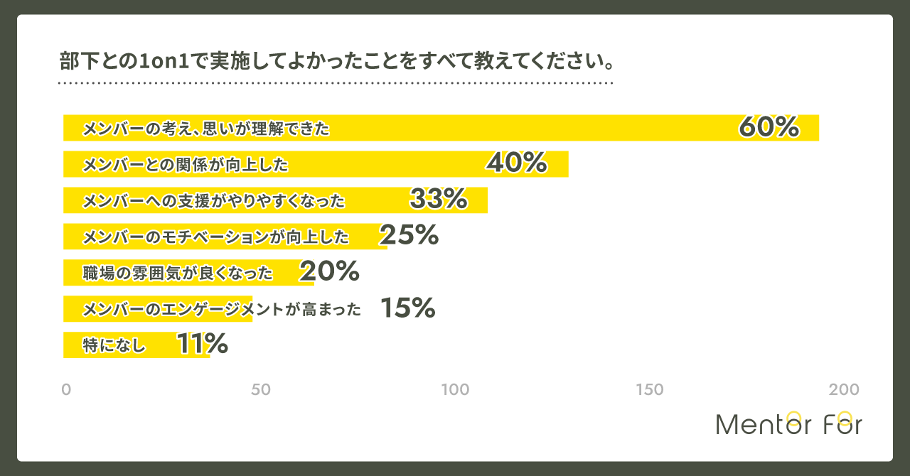 また、実感している1on1の効果としては、「メンバーの考え、思いが理解できた(60%)」「メンバーとの関係が向上した(40%)」「メンバーへの支援がやりやすくなった(34%)」となり、日頃複数人での会話では気づけなかった部下個人の考えや思いが理解できることにメリットを感じている傾向が強いことがわかりました。