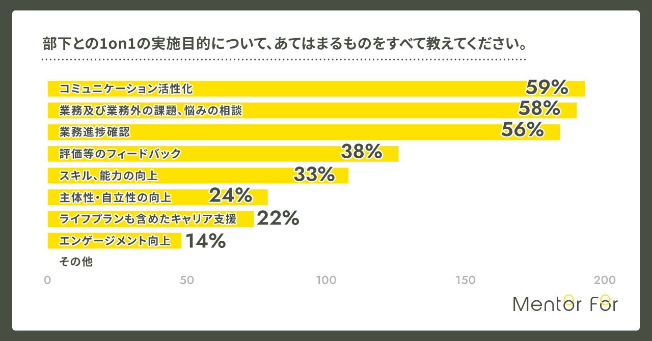 1on1の目的について質問したところ「コミュニケーションの活性化(59%)」「業務および業務以外の課題、悩み相談(59%)」「業務進捗確認(57%))」など日頃の業務遂行がスムーズにすることが主目的であることがわかりました。