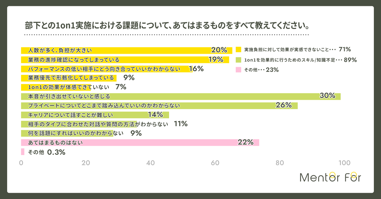 2大課題は、「実施負担に対して効果が実感できないこと」と「1on1のスキル/知識不足」