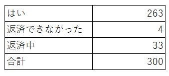 300人中263名(約87.7%)が完済しており、33名の方が返済中、4名の方が完済できなかったと回答しています。