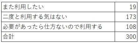 300名中173名(約57.7%)の方が消費者金融は「二度と利用する気はない」と回答しており、約42.3%の方が「また消費者金融を利用したい」もしくは「必要があったら仕方ないので利用する」と回答しています。