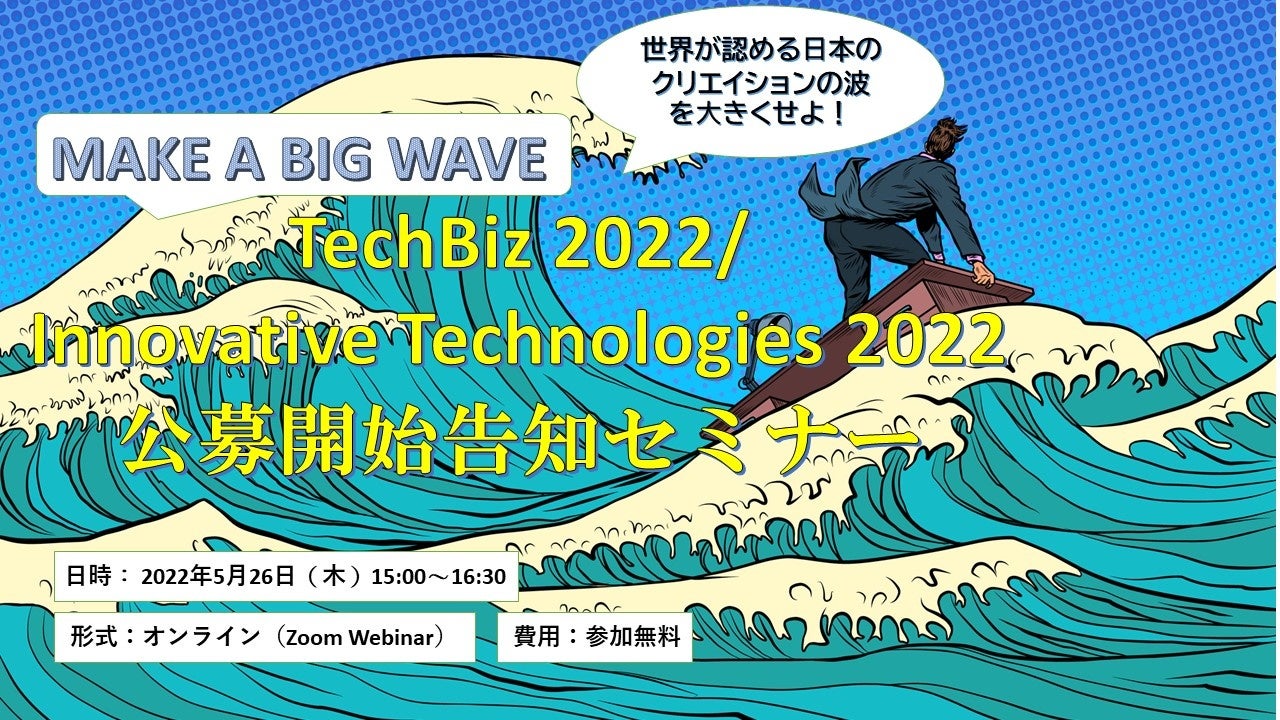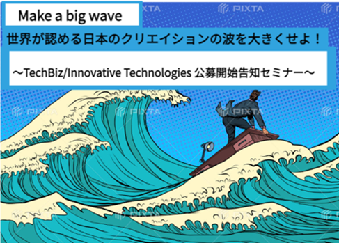 1.タイトル:「Make a big wave - 世界が認める日本のクリエイションの波を大きくせよ!~TechBiz/Innovative Technologies 公募開始告知セミナー~」